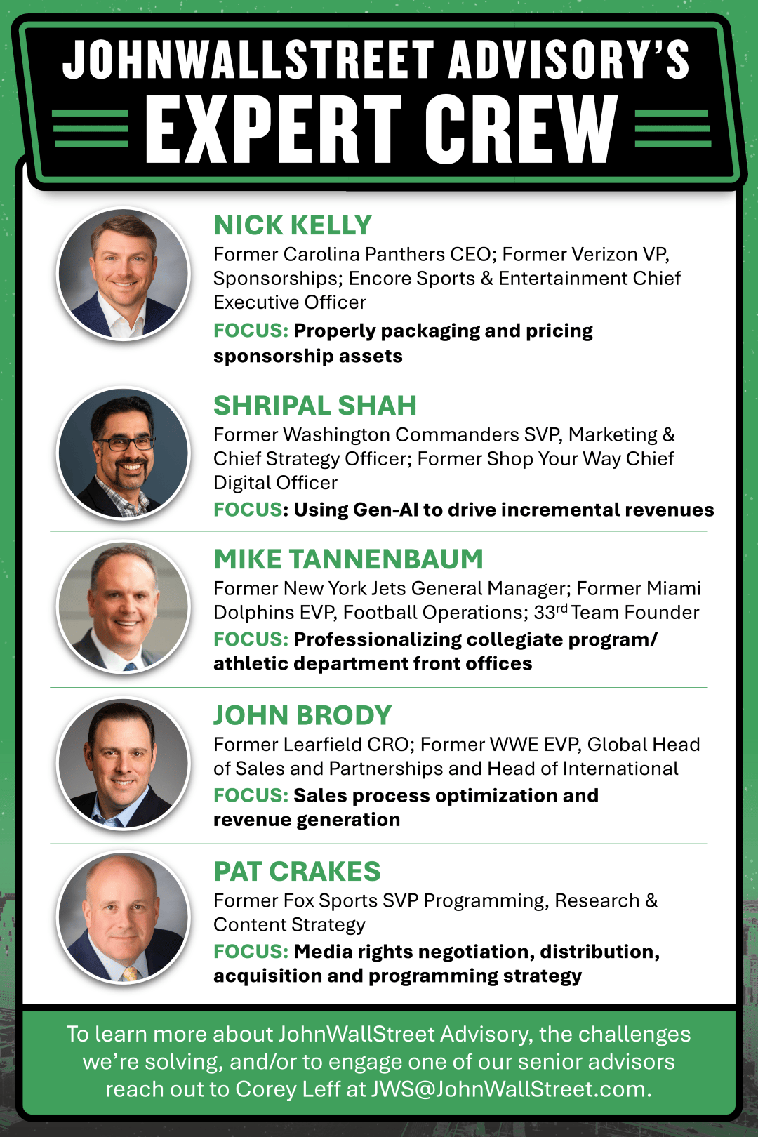 John Brody – Former Learfield CRO; Former WWE EVP, Global Head of Sales and Partnerships and Head of International; Former NFL SVP, Sponsorship and Media Sales; Former Wasserman Media Group President, Global Partnership and Business Development