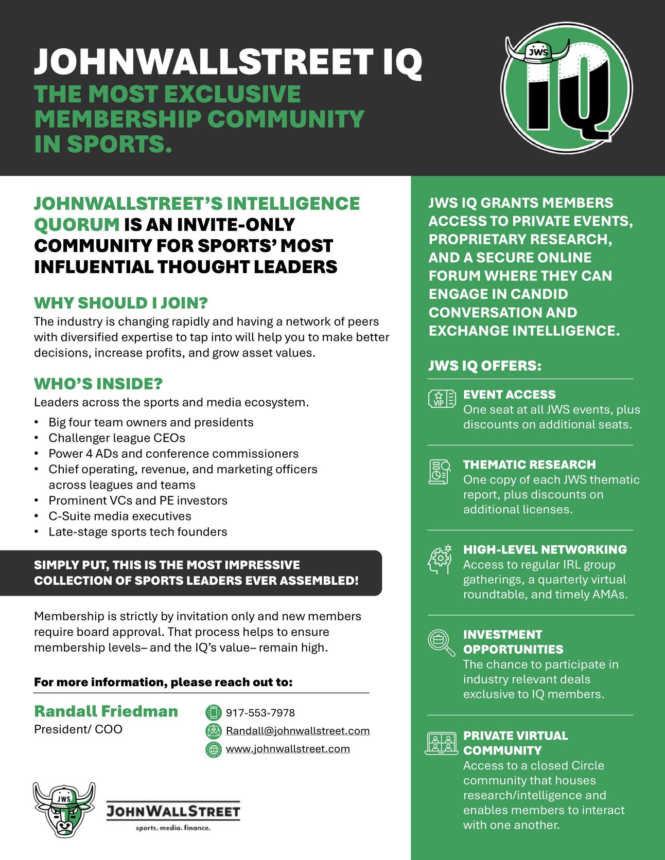 JohnWallStreet’s Intelligence Quorum (aka JWS IQ), our high-end membership community, was created to help sports and media’s senior leaders see around corners and skate to where the puck is headed before it arrives.